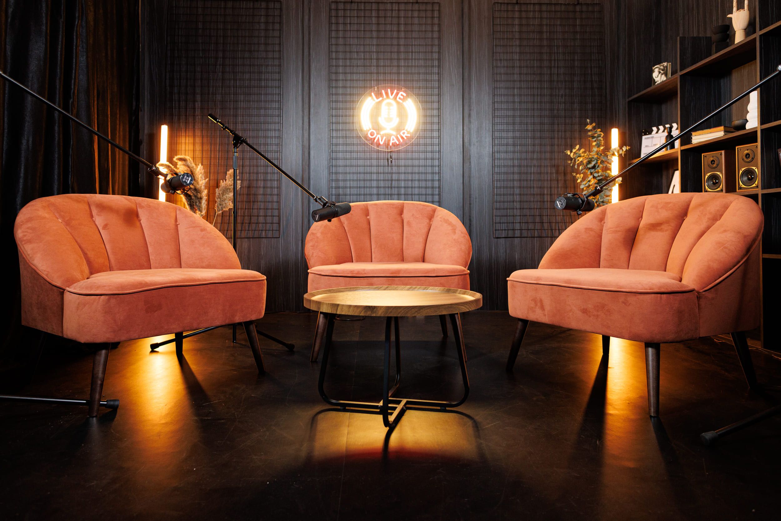 В интерьере студии доминируют темные тона, придающие локации лаконичный премиальный стиль, придают пространству визуальную глубину и изысканность. Декоративные акценты и аксессуары добавляют индивидуальности и шарма, делая интерьер уникальным. В случае необходимости подсветка помогает разбавить атмосферу и добавить цветные нотки. В классическом исполнении студия мебелирована роскошными терракотовыми креслами, которые создают атмосферу уюта и располагают к открытой дискуссии. Для делового формата вы можете выбрать массивный стол и офисные кресла.