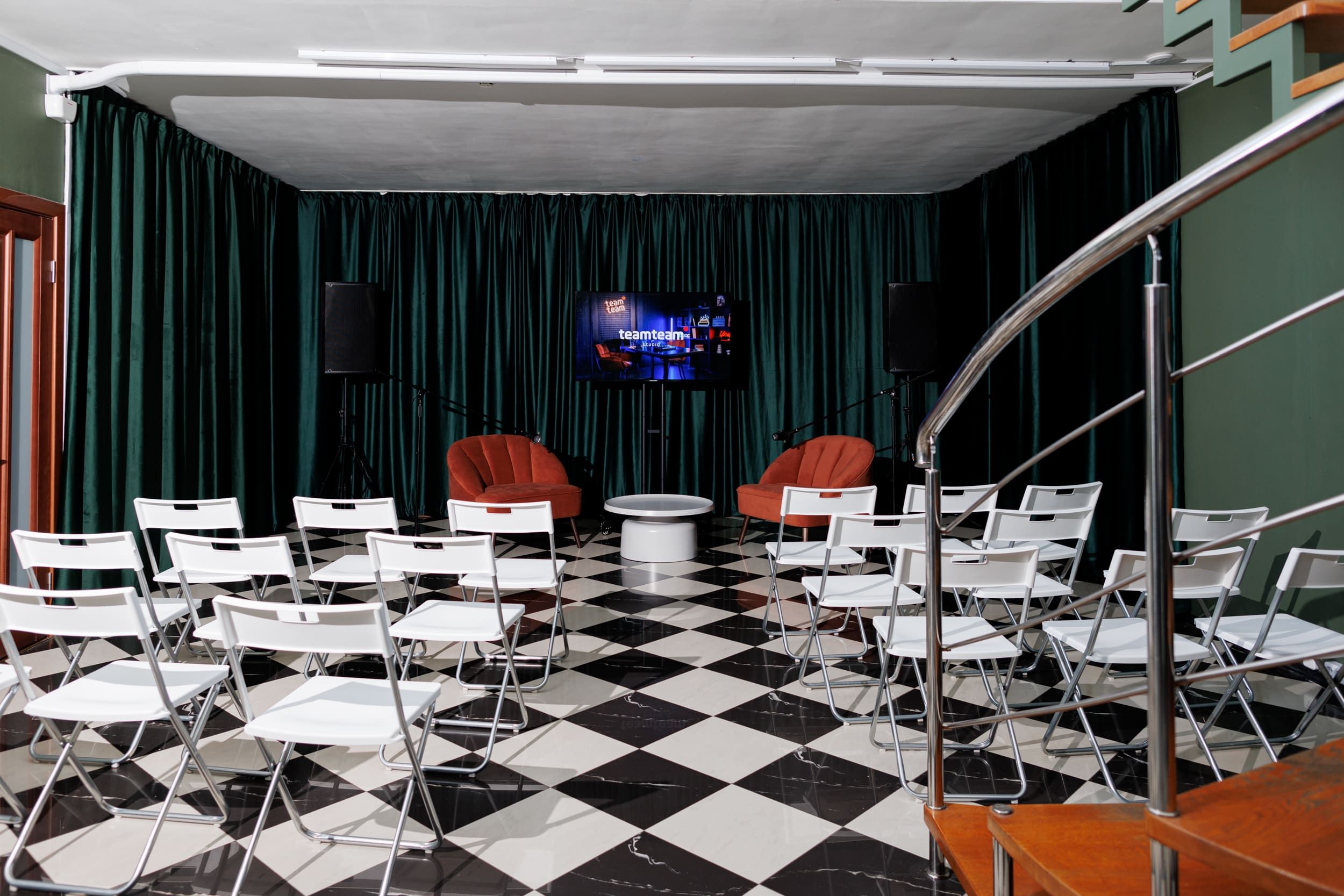 На площади 60 квадратных метров мы создали пространство, идеально подходящее для интервью, панельных дискуссий и открытых записей с участием зрителей. Здесь можно комфортно разместить до 30 человек.