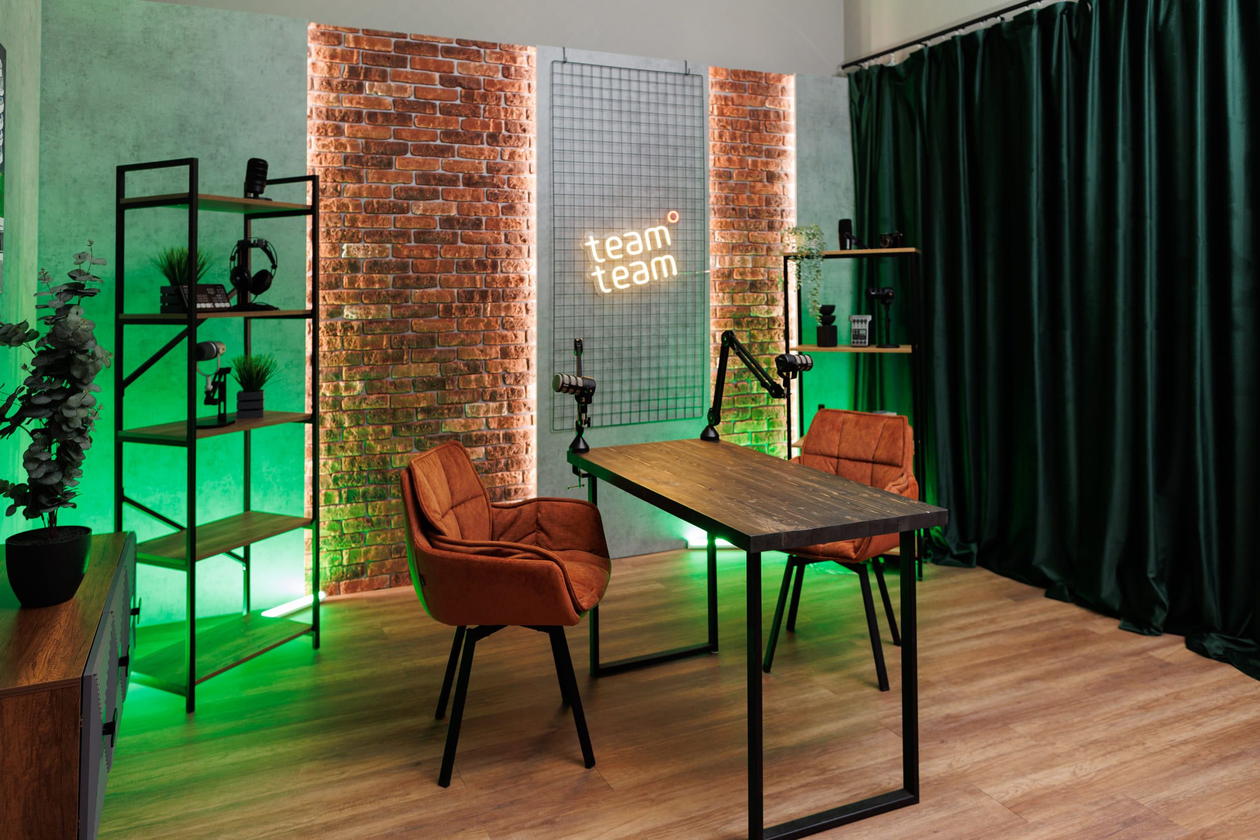 В интерьере студии доминируют темные тона, придающие локации лаконичный премиальный стиль, придают пространству визуальную глубину и изысканность. Декоративные акценты и аксессуары добавляют индивидуальности и шарма, делая интерьер уникальным. В случае необходимости подсветка помогает разбавить атмосферу и добавить цветные нотки. В классическом исполнении студия мебелирована роскошными терракотовыми креслами, которые создают атмосферу уюта и располагают к открытой дискуссии. Для делового формата вы можете выбрать массивный стол и офисные кресла.